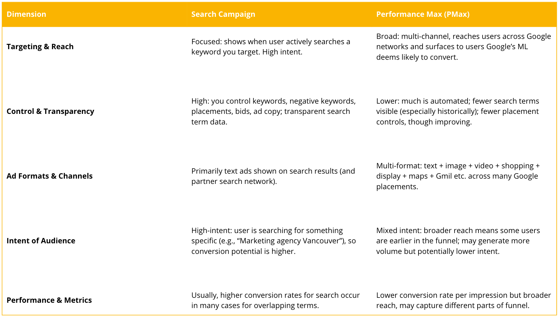 For high-intent searches (where users are actively looking for what you offer), Search campaigns often outperform PMax in terms of conversion rate and value. Additionally, search campaigns tend to offer strong CTR and fewer invalid clicks.